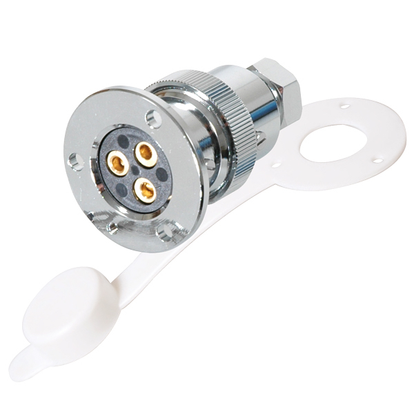 12V däckskontakt i kromad mässing med packning och plastlock monterat på kedjan.