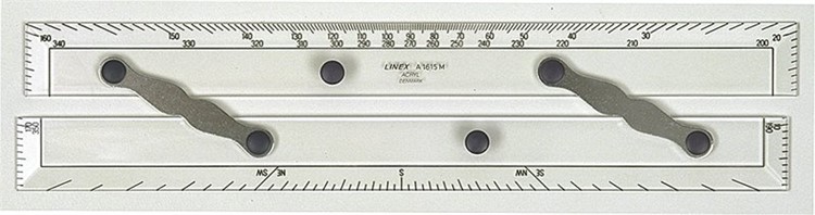 Med fasade kanter på alla 4 sidor och vinkelmätare. Inbyggda fjädrar ger lätt glidande gång. Försänkta korkskivor på undersidan hindrar linjalen från att glida. Indelning 360°. Armar av aluminium och beslag av plast. Material: kristallklar akryl.. Längd 300mm. Tjocklek 3mm.