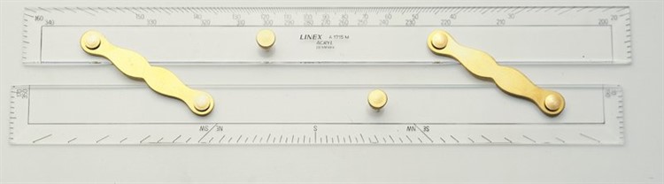 Med fasade kanter på alla 4 sidor och vinkelmätare. Inbyggda fjädrar ger lätt glidande gång. Försänkta korkskivor på undersidan hindrar linjalen från att glida. Indelning 360°. Armar och beslag i mässing. Material: kristallklar akryl. Längd 380mm. Tjocklek 4mm.